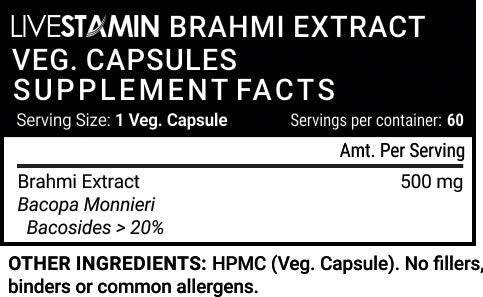 Livestamin Brahmi/Bacopa Monnieri Extract (Bacosides > 20%) Supplement, 500 mg - 60 Vegetarian Capsules