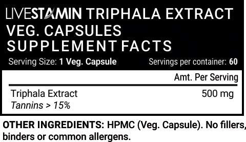 Livestamin Triphala Extract (Tannins >15%) Amlaki, Haritaki and Bibhitaki, Digestion Support Supplement,500 mg - 60 Vegetarian Capsules